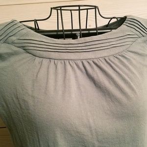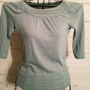 Sage green top with pretty neck details. 3/4 length sleeves. Looks very cute with a navy cardigan paired with it! Lightly worn.