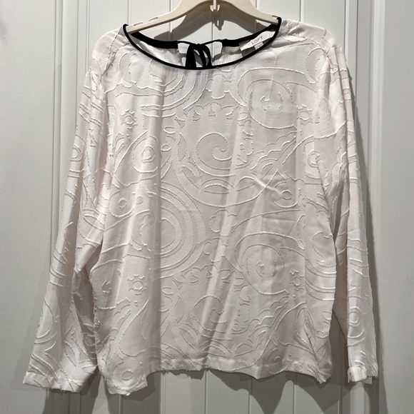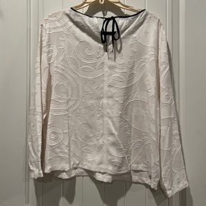 This white top, almost cream, is beautiful for the office or a night out. The swirl design is made of soft frays. Has a cute tie at the top in the back. Semi-see through. Non-smoking, no-cat home.
