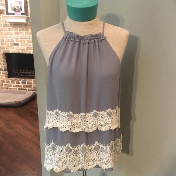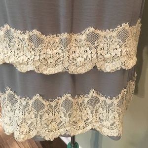 This great top can transition perfectly from summer to fall. it's a pretty blue-ish gray color with light ivory lace layered detail at the hem.