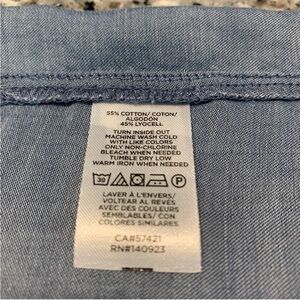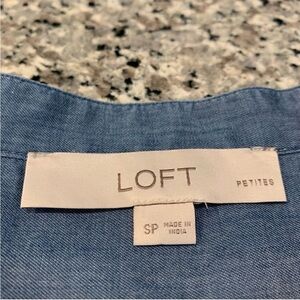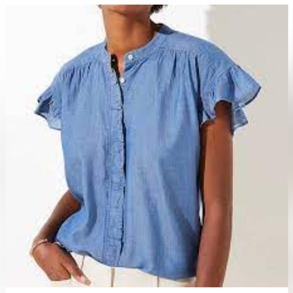 Loft Women's Chambray Denim Button Front Top Shirt Blouse Size SP. Elevate your style with this cute blue ruffle sleeve top. Perfect for any occasion, this top looks cute with jeans and work pants.