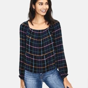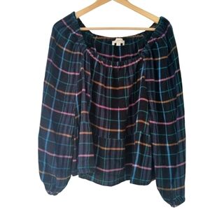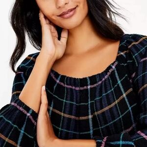 LOFT Top Square Neck Line Cropped Puffed Sleeves Peplum Hem Plaid Size Medium