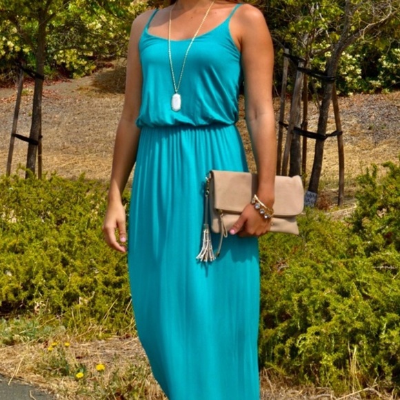 Chic turquoise maxi dress. Sleeveless and flowy. Ideal for warm days.