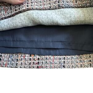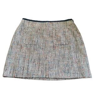 LOFT Tweed Pocket Shift Mini Skirt NEW Colorful Lined Office Siren NWT Size 12. Condition: New with tags. Blue intricate stitched detail at waist. Consul tweed fabric with shimmery thread running throughout. Lined. Hidden side zipper. 81% polyester/18% acrylic/1% other fiber. Machine wash cold delicate cycle. Line dry. Two front latch pockets.