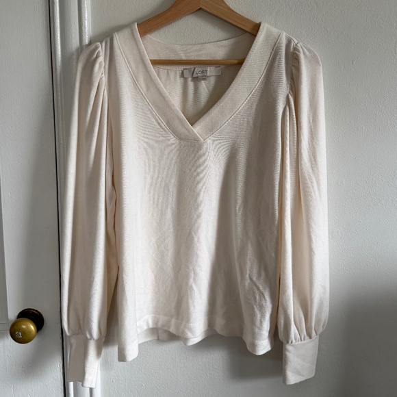 LOFT V-Neck Knit Top with Ruched Sleeves - Cream / Bone size S