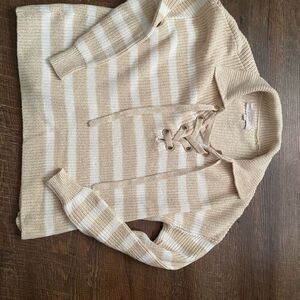 This LOFT v-neck sweater is a blend of style and comfort featuring a chic lace-up detail. The creamy tan and white color palette, combined with wide horizontal stripes, adds a touch of flair to your wardrobe. Crafted from a soft knit, this sweater will keep you warm and cozy for any casual occasion.