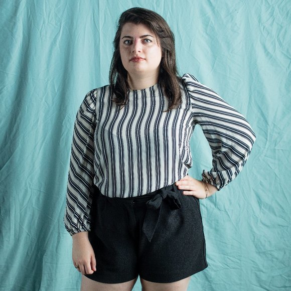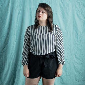 LOFT sheer blouse with vertical black and white stripes. Slightly puffed shoulders, elastic sleeve cuffs, and a fabric button slit at the neck on the back of the top. Very light.