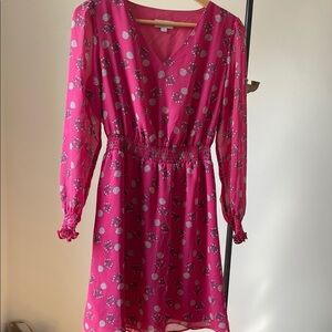 Vibrant pink dress with floral design. Features a flattering V-neckline.