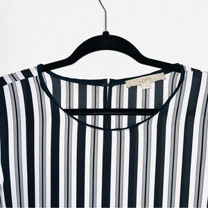 LOFT white & black striped blouse. In excellent condition! Crew neckline. Long sleeves. Wide bell sleeve cuffs. Keyhole back with button closure. White with black stripes. Size large.