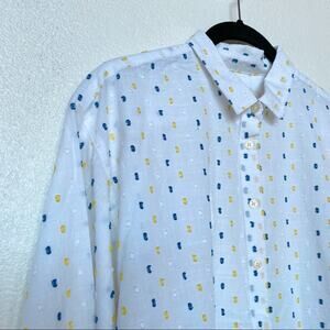 White collared button down top from LOFT. Yellow, white and blue swiss dot all over pattern. Great pick for the office!