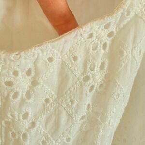 LOFT A charming white eyelet dress perfect for warm weather occasions. This sleeveless dress features a delicate ruffle neckline and a flattering tiered silhouette that adds a touch of femininity and movement. The intricate eyelet detailing throughout the dress provides a beautiful, airy texture and a breathable feel. Its relaxed fit ensures comfort and ease of wear, making it a versatile choice for a variety of activities. Ideal for a casual brunch, a garden party, or a sunny day out. Pre-loved in good condition, has a small stain on the armholes. Both sides refer to photos. Approximate measurements laid flat Pit to pit 18" Shoulder to hem 35" Keywords: white dress, eyelet dress, sleeveless dress, tiered dress, ruffle neck, casual dress, summer dress, boho dress, feminine dress, vacation dress, beach dress, cotton dress, midi dress All offers are welcome,let me know if you have anyquestion