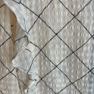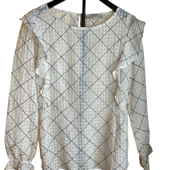 Chic white blouse featuring a grid pattern. Delicate ruffle details on the sleeves. Ideal for versatile styling.