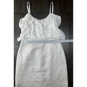 Keywords: white dress, midi dress, cocktail dress, party dress, ruffle dress, sleeveless dress, wedding guest dress, summer dress, formal dress, dressy casual, textured dress, wedding