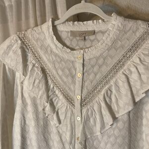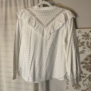 Elegant white blouse with ruffled yoke and button-up front. Perfect for a stylish look. NWT from smoke and pet free home