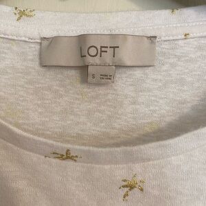 This stylish LOFT t-shirt features a playful gold palm tree pattern on a crisp white background. Perfect for casual outings, this top combines comfort with a touch of fun.