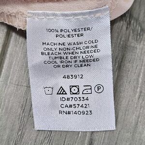 This is a sleeveless tank top blouse from Ann Taylor Loft in size large. The top features a pale pink color with a polka dot pattern, making it suitable for workwear. It has wide straps and a button accent for a stylish touch. The lightweight and breathable fabric, made of polyester, is perfect for the summer and spring seasons. Easy to care for with machine washable instructions, this basic top is a versatile addition to any wardrobe.
