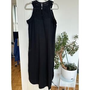 This elegant black sleeveless dress is perfect for any occasion. Its classic design and comfortable fit make it a wardrobe essential. This knit halter dress has a crochet detail at the neck that amps it up a bit. The skirt has a curved hem with side slits