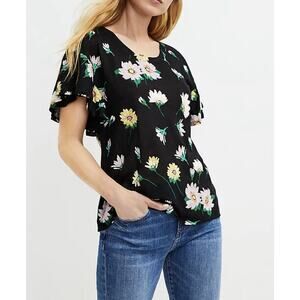 LOFT Womens Black Floral Linen Flutter Wedge Tee, Size Small, NEW