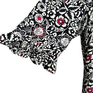 LOFT Women’s Black White Pink Floral Ruffle Cuff Midi Dress Zip Back - Size 12