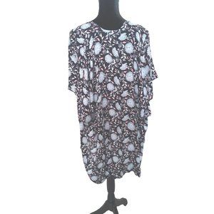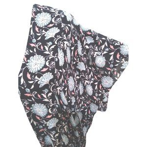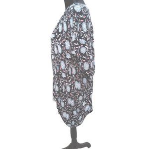 LOFT Women's Black and Floral Open Front Short Sleeve Leaf Top Size XSmall. Very light, roomy, and the perfect over blouse to go over a tank top this summer. You could also use this open blouse to throw over your swimsuit. The length is 26 inches in the front and 28 inches in the back and is 100% rayon. Batwing sleeves.