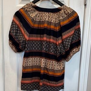 Stylish LOFT blouse with intricate patterns. Features black and orange hues. Perfect for casual wear.