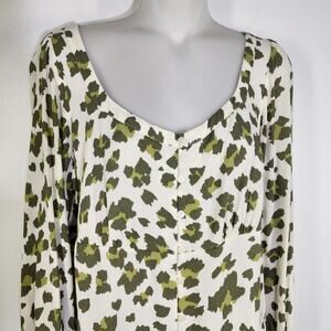 LOFT Women’s Blouse Small Ivory Green Cheetah Print Smocked Cuff Square Neck
