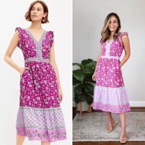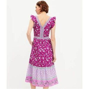 LOFT Women's Border Ruffle Floral V-Neck Sleeveless Midi Dress Size 10