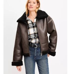 Stay warm and stylish with this brown shearling aviator jacket from LOFT. Size medium, new with tags. Measures 21" long, sleeves are 20" and bust is 23.5"