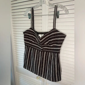 This Ann Taylor LOFT cami is a dark brown and off white color. Some of the pictures make it look black but it is clearly brown in person. Cute boho vibe and perfect for summer. Straps are not adjustable. Side zipper. Empire waist style. Size 12; measurements in photos. Made of 100% cotton; no fabric care tag. Lightweight and will look cute dressed up with trousers or down with jeans or shorts. Very versatile blouse.
