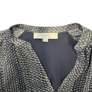 Stylish LOFT dress featuring a unique gray and black snake print pattern. This chic dress has a flattering V-neckline and long sleeves with tie details at the cuffs, adding a touch of elegance. The elasticized waist creates a comfortable and defined silhouette, while the lightweight fabric ensures a breezy feel. Perfect for a business casual setting, a lunch date, or a sophisticated evening out.