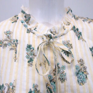 LOFT women's button front blouse. Delicate ruffle at neckline and sleeve. Tie at neckline. White and yellow stripe with floral pattern. Pleating in front. Shoulder pleat.
