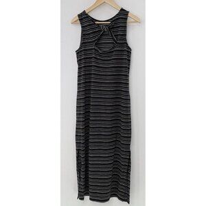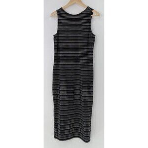 The LOFT Women's Jacquard Striped Twist Back Cutout Stretch Dress in size M is a stylish and versatile piece perfect for a preppy look. The dress features a high neck, sleeveless design, and a pullover closure for easy wear. Made from comfortable modal knit fabric, this midi-length dress is machine washable and lined for added quality. The black dress with colorful stripes is ideal for casual outings, workwear, or even travel, making it a must-have addition to any woman's wardrobe. Good used condition. No stains or holes found. Please feel free to ask any questions.
