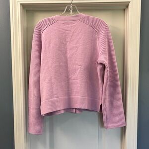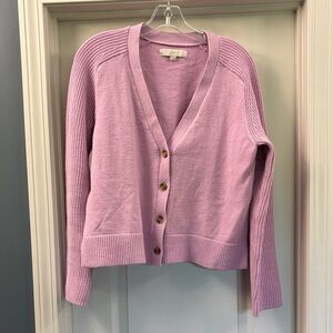 Chic lavender cardigan with button-up front. Ideal for layering. Soft and stylish design.