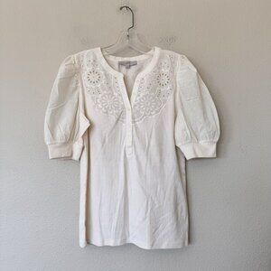 LOFT Womens Medium Cream 1/2 Button Lace Eyelet Top Short Sleeve Stretch