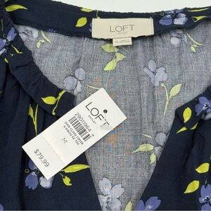 LOFT Women’s Navy Long Sleeve Blouse Dress M Purple Lime Floral Design Ruffles