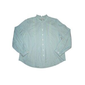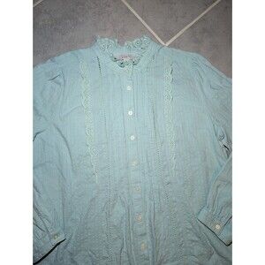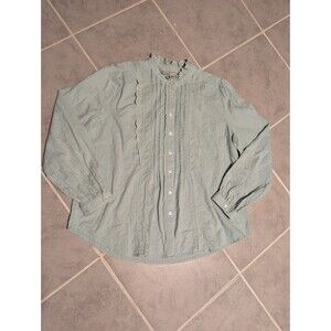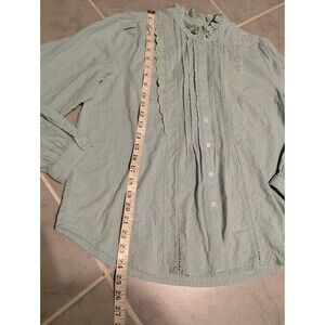 The LOFT Women's Sage Green BluCottagecore Lace Trim Pintuck Button Front Blouse in size L is a versatile and stylish addition to any woman's wardrobe. Made from soft cotton fabric with a lovely lace trim, this blouse features a round neckline, long sleeves, and a button closure. The pintuck details add a touch of sophistication to the basic style, making it suitable for all seasons. Perfect for layering in the winter or wearing on its own in the warmer months, this blouse from Loft is both comfortable and chic.