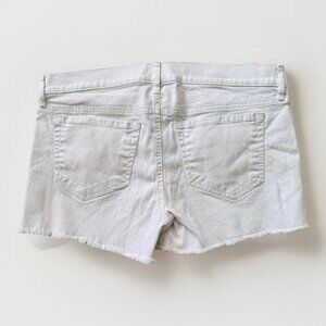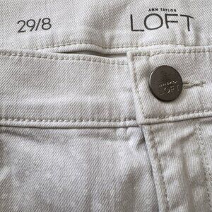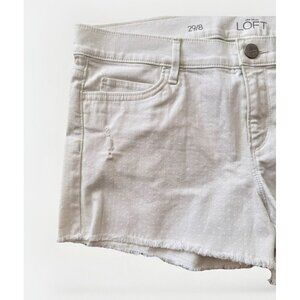 These white denim shorts by LOFT feature a frayed bottom with subtle polka dots. They have a button closure, a 5-pocket design, and a flat front. The shorts are made of a cotton blend fabric with a light wash. The waist size is 29 inches and they are a size 8 in a regular fit. Perfect for a casual summer or spring occasion, these classic shorts add a touch of style to any outfit.