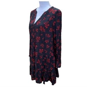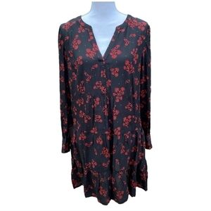 LOFT Womens Size Large Black Red Floral Tiered Dress Long Sleeve Split Neck