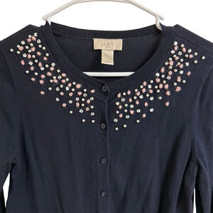 LOFT Women’s Size Sm Navy Blue Embellished Jewel Beaded Cardigan Button Sweater