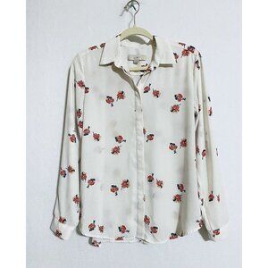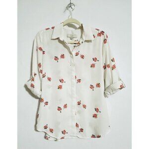 LOFT Womens Small White Button Up Top Roll Tab Long Sleeves Pink Floral Print