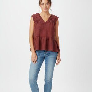 A charming LOFT top perfect for warm weather days. This sleeveless, maroon peplum top features a flattering V-neck and a delicate tie-back detail, adding a touch of feminine flair. The smocked bodice provides a comfortable and flexible fit, while the tiered peplum hem creates a stylish, flowy silhouette. The textured fabric adds visual interest and a touch of sophistication to the design. Perfect for a casual brunch, a garden party, or a relaxed weekend outing.