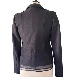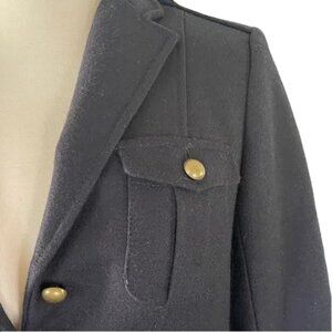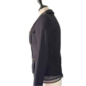 Chic black blazer with gold button details. Features front flap pockets. Perfect for a stylish ensemble.