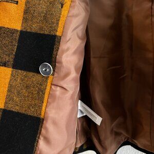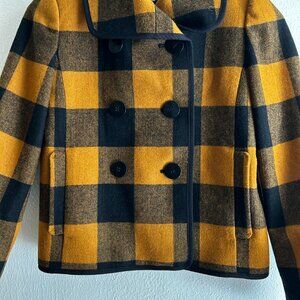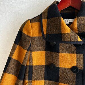 Ann Taylor LOFT buffalo plaid wool coat in a cozy mustard yellow and black check pattern. Cropped double-breasted peacoat silhouette with welt pockets, black piping trim, and button-tab sleeves. Fully lined and warm, perfect for fall and winter.