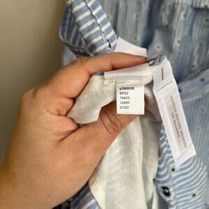 Beautiful pale blue wrap-style midi dress by LOFT, made from 100% breathable cotton with subtle embroidered eyelet detail. Features ruffle sleeves, tie waist, V-neckline, and flattering A-line silhouette. Perfect for spring/summer, vacations, or events.