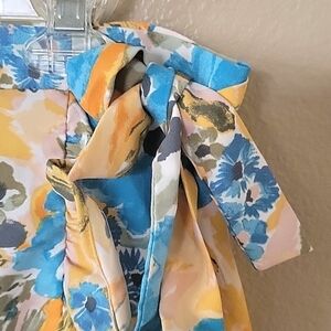 Like new LOFT yellow and blue floral printed ruffle trim faux wrap skirt with zipper in back