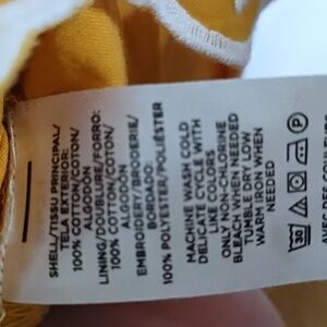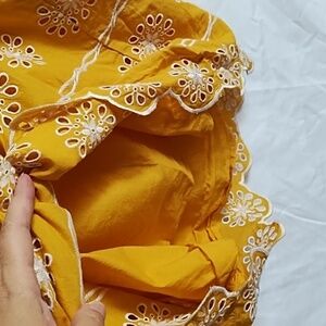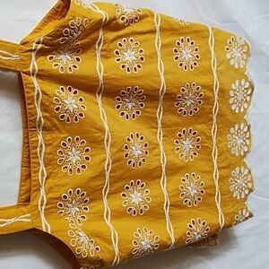 Charming yellow tank top with floral embroidery. Features wide straps and scalloped hem. 18 inches across 23 inches from shoulder to hem.