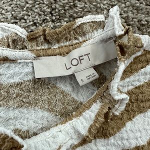Fits more like a medium. Great blouse for work. Small ruffle on arm and neck trim. Great condition.