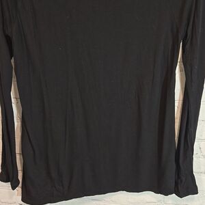 In good used condition no flaws. Black long sleeve with mockneck and lace detail front