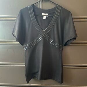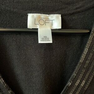 LOFT black sequin top. Light knit /sweater material. The material tag was removed so I cannot say exactly the material type . There is a little stretch to it . The sleeves are a larger more open sleeve . Beautiful condition.