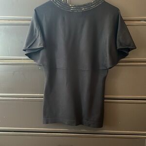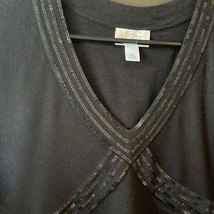 LOFT black sequin top. Light knit /sweater material. The material tag was removed so I cannot say exactly the material type . There is a little stretch to it . The sleeves are a larger more open sleeve . Beautiful condition.