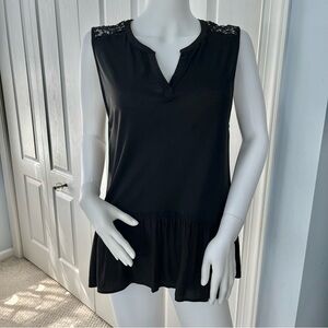 LOFT sleeveless black top with lace at the shoulder and ruffled hem. V-neck. 100% rayon. Size medium